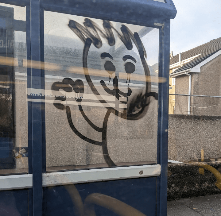 Standing alone at the bus stop. Cold and wet from the rain, but taking shelter beneath the plastic erm shelter.