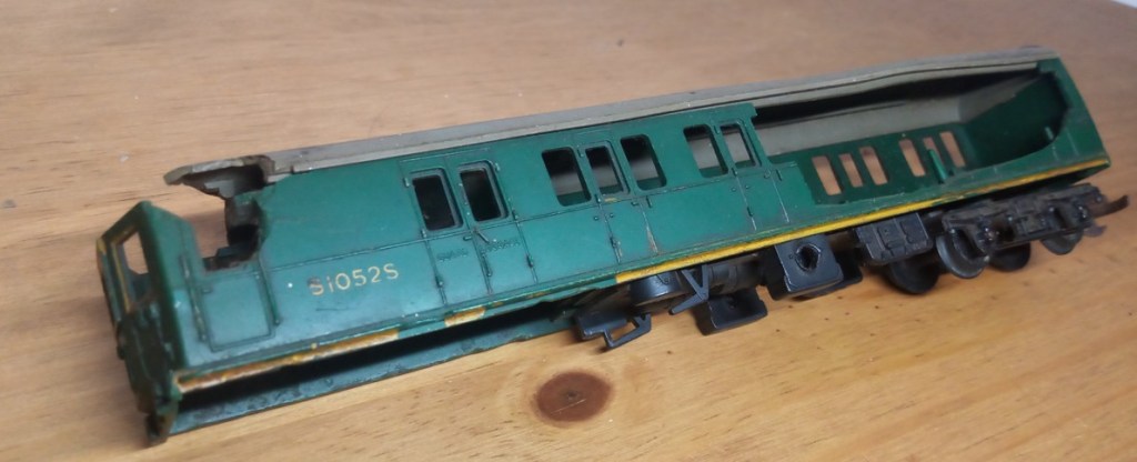 The motorised car is in an even sorrier state. Its missing the motor bogie, and its missing huge chunks of the body. Part of the undercarriage has a hole burned through it, possibly as some sort of repair in the distant past. The roof is distorted, either by age or heat, and its no less filthy than the trailer car. Plus we’re also missing the glazing, and probably the interior detail, if this model ever had that to begin with.