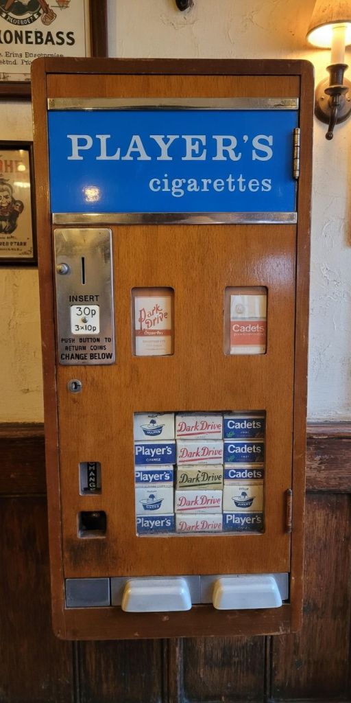 The biggest change from Orwell’s time is the smoking ban. The air may be cleaner, but gone is the smokey charm. And gone too are the cigarette machines. I am self censoring here, no one called them cigarette machines, but we’ll run with it. Somewhere in every pub, often near the door or the toilets was a vending machine that would sell packets of 16 cigarettes, in boxes the size of twenties. The perfect pub sells them in twenties, they would be tax exempt, and by some ill understood legal concession, smoking is permitted in some areas.