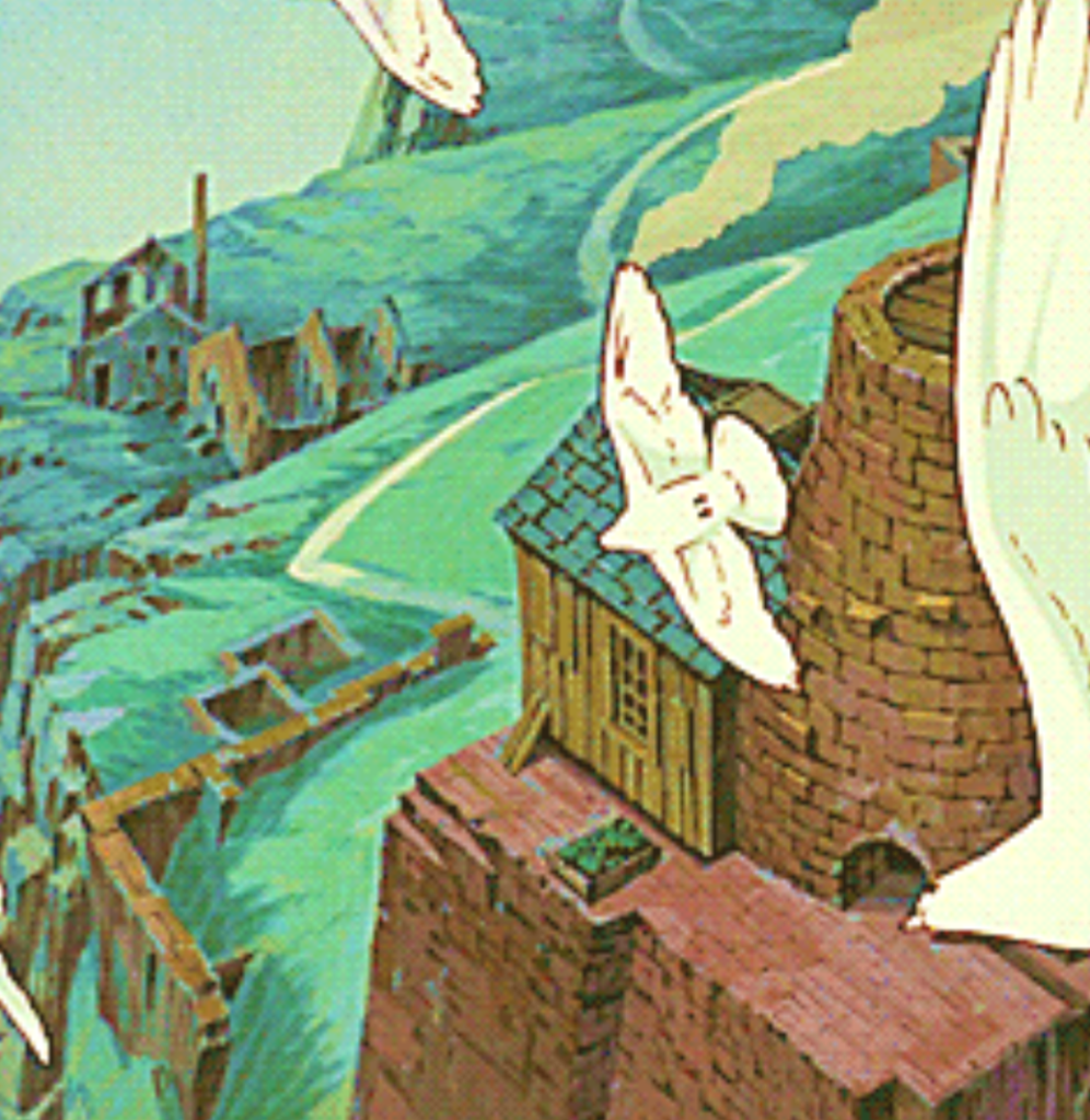 When and where this is, we do not know, but there seems to have been a great destructive war and the people that are left are just getting on with it. The backdrop is that of post industrial decline. Crumbling brick buildings, factories, furnaces, mines. It’s a nostalgic post golden-age golden age. That’s the only way I can describe it.