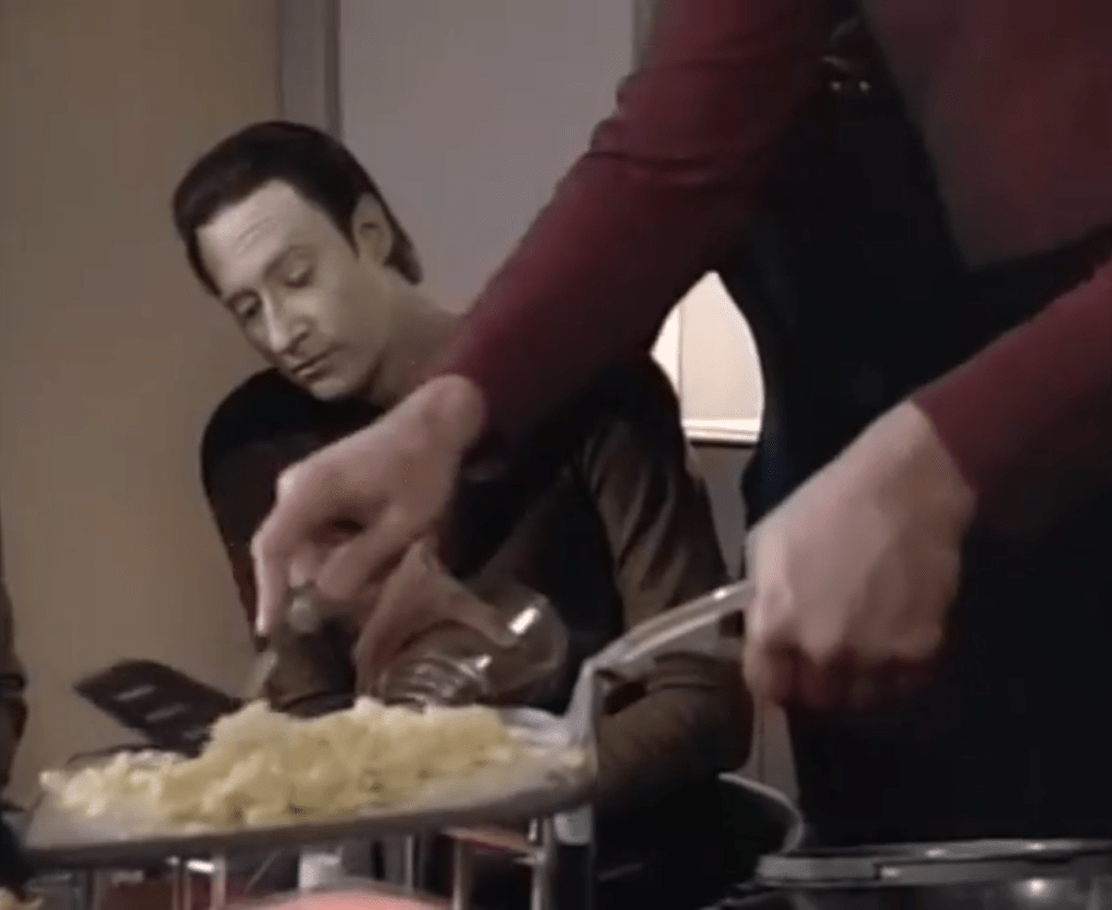 Star Trek is that bizarre utopian future where everything is taken care of, but they’re on a star ship exploring the universe, so not the same as our situation. I think if I was on a star ship I too wouldn’t be bothered by the coloured food cubes, they’re in space, meeting aliens. There are exceptions though. Commander Riker sees the failings of the replicated food and he tries to cook eggs, but he’s not very good at it.