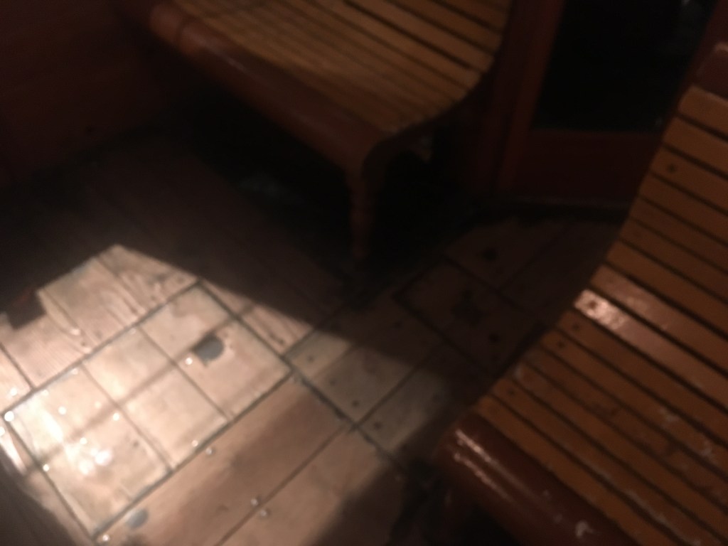 With a stutter and a sputter, the sound of the engine died to nothing, and the lights blinked out. With my torch still in the cab, we were, but for a small green square of light by the doors, in absolute pitch black darkness. There was a crunching scraping sound on the ballast outside, footsteps.